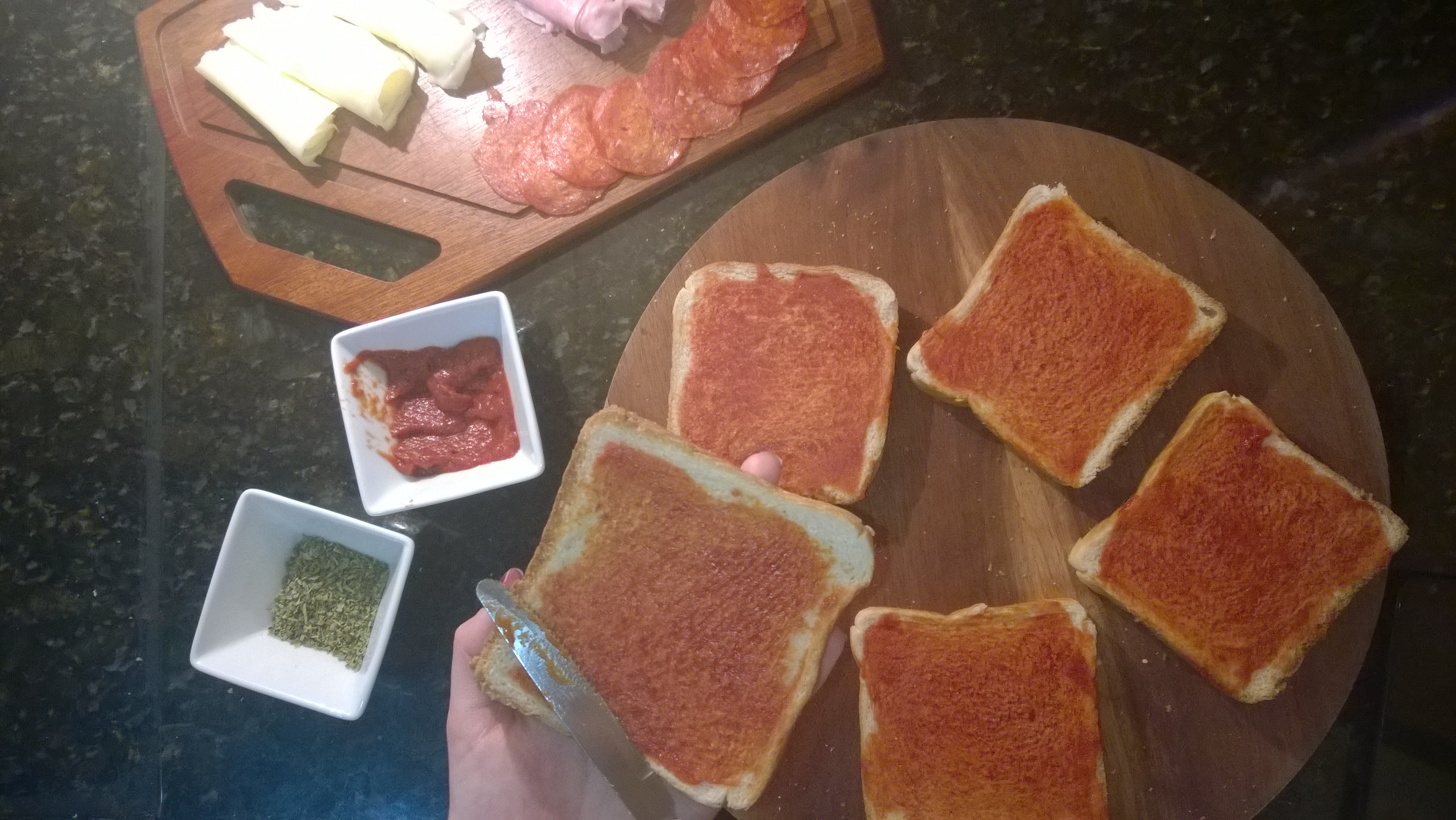 Passe o molho de tomate no pão.